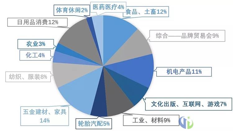 山东省历来工业门类齐全,行业发展涵盖了41个门类。针对行业集中的特色优势,工业类、机电类和五金、家居类展会连续成为了山东省的扶持重点。由统计图表可见,仅五金家具和机电类展会,就已达展会总体占比的五分之一。