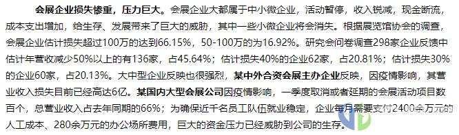 中国会展经济研究会问卷调查298家企业反馈中,估计年营收减少50%以上的有136家,占45.64%;估计损失40%的企业62家,占20.81%;估计损失30%的企业60家,占20.13%。
