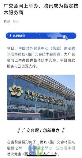 腾讯也成为了2020年广交会的技术服务商,将利用微信、腾讯云、腾讯会议、企业微信、翻译君、企点等产品和服务能力,联合加强供采对接服务,在线举办专场对接活动。