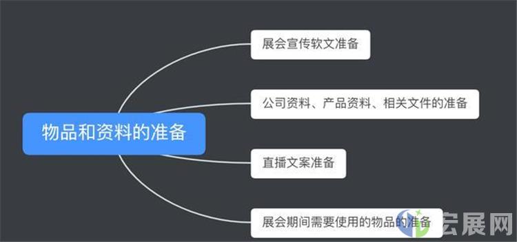 物品和资料准备主要包括4三方面:第一,展会宣传推广准备;第二,公司资料、产品资料、相关文件的准备;第三,直播文案的准备;第四,展会期间需要使用的物品准备。