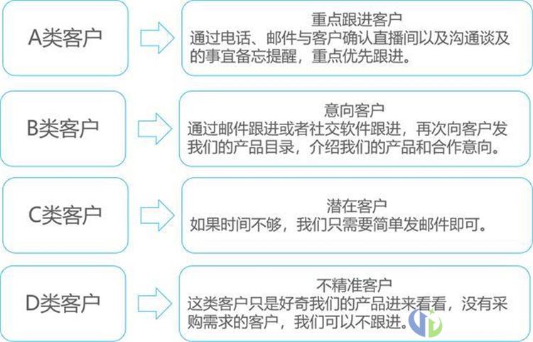 D类客户:不精准客户。这类客户只是好奇我们的产品进来看看,没有采购需求的客户,我们可以不跟进。