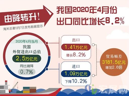 据海关总署数据显示,4月份我国外贸进出口总值2.5万亿元,同比微降0.7%。其中,出口1.41万亿元,增长8.2%;进口1.09万亿元,下降10.2%;贸易顺差3181.5亿元,增加2.6倍。