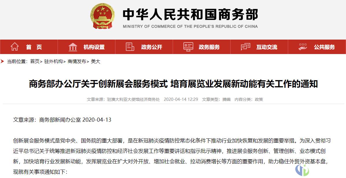 4月13日,商务部发布《关于创新展会服务模式 培育展览业发展新动能有关工作的通知》,明确指出要积极打造线上展会新平台、促进线上线下办展融合发展、培育线上展会龙头企业和品牌展会。