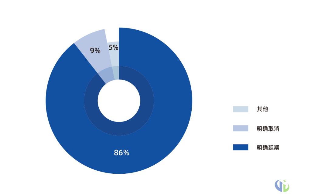 根据ExpoSCM通过网络公开渠道采集的数据,截至4月27日,全球86%的展会在疫情下选择延期,9%的展会明确取消,还有5%的展会选择线上、如期、分拆、合并等其他方式。