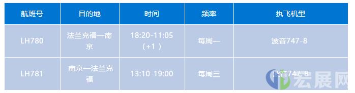 7月4日,德国汉莎航空宣布,将恢复“法兰克福—南京”LH780/781航班。航班恢复初期为每周一班,计划使用波音747-8客机执飞,首个“法兰克福—南京”航班于7月6日星期一从法兰克福出发,首个“南京—法兰克福”航班于7月8日星期三从南京回程。