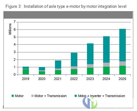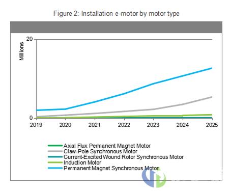 作为车辆电气化的重要特征,内燃机作为驱动力源的作用已被电动机部分或完全取代。电动驱动系统市场已经出现了与新能源汽车市场相应的快速增长。2019年,中国在轻型汽车中安装的电动机总数为230万,其中130万安装在插电式汽车中,其余用于混合动力汽车。