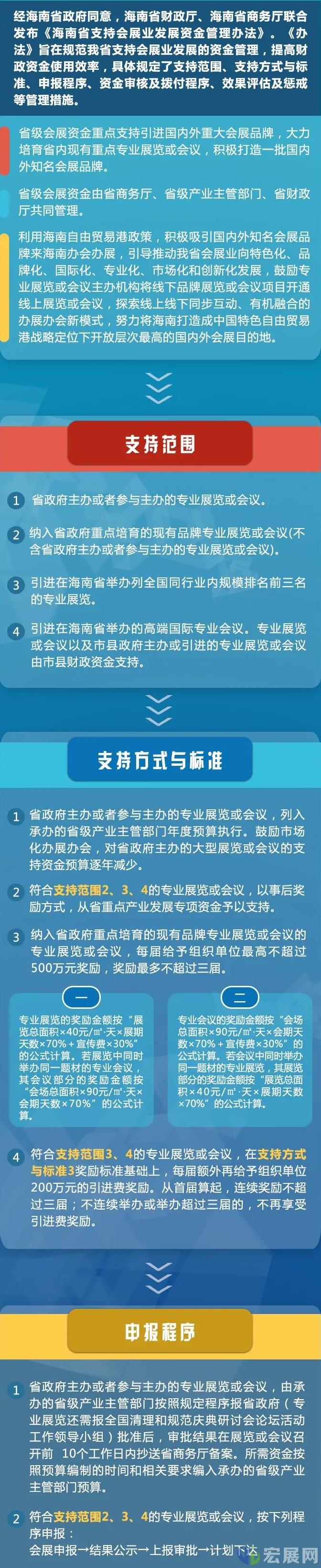 《海南省支持会展业发展资金管理办法》将重点支持海南省政府主办或者参与主办的专业展览或会议、纳入海南省政府重点培育的现有品牌专业展览或会议、引进在海南省举办列全国同行业内规模排名前三名的专业展览、引进在海南省举办的高端国际专业会议。