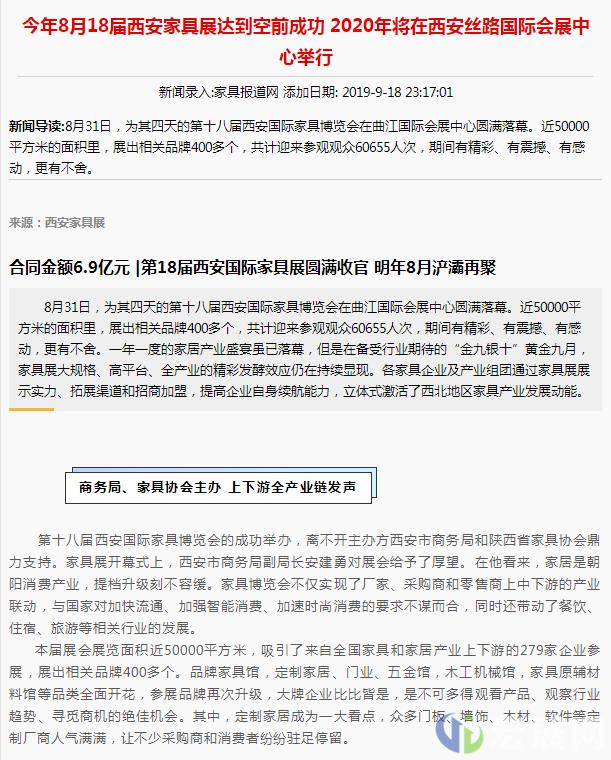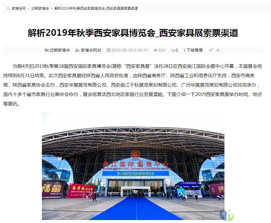 每年展会期间,相关媒体也会对展会盛况进行全方位、高覆盖式的宣传报道。《中国家具报道》、《中国经贸·家具中国》、《家居世界》、《华东家具》、《家居人物》、《家具酷》、香河家具城、家具迷、家具专区网、中国旅游报、中国信息报、陕西日报、西安晚报、华商报以及陕西各电视台等,都可见西安家具展的身影,其热度可见一斑。
