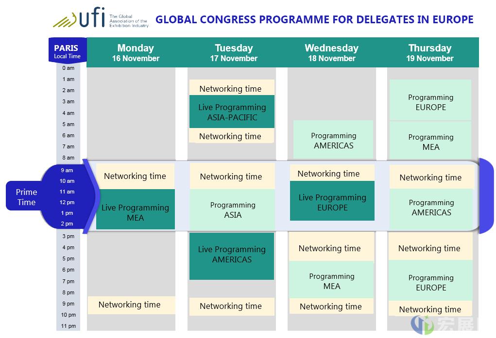 第87届UFI全球年会将于11月16日至19日举行,分别在伦敦(欧洲)、迪拜(中东)、香港(亚太)、波哥大(美洲)四地分4个时区通过在线讨论,演讲和演示向全球会员呈现。参会者可以在全球年会开始以前、举办期间和在年会结束以后,通过年会的线上平台,在参会者认为最合适的任何时段与世界各地的与会者建立网路,互动交流。