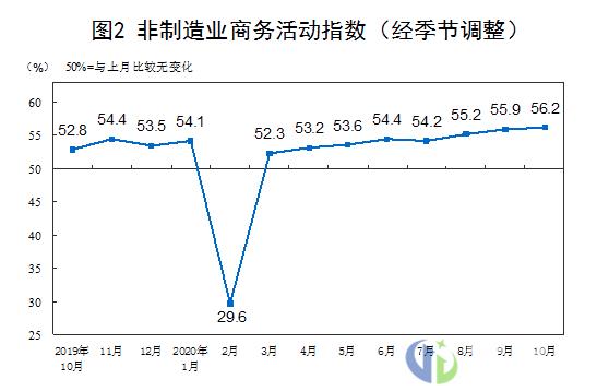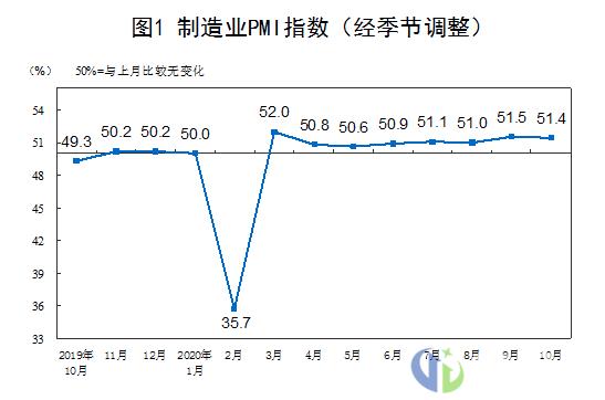 中国国家统计局和物流与采购联合会CFLP周六联合公布,宏观经济先行指标——10月制造业采购经理人指数PMI微降至51.4,连续八个月处于扩张区间;10月非制造业商务活动指数环比上升0.3个百分点至56.2,为2013年10月以来最高,当时是56.3;10月综合PMI产出指数为55.3,比上月上升0.2个百分点。