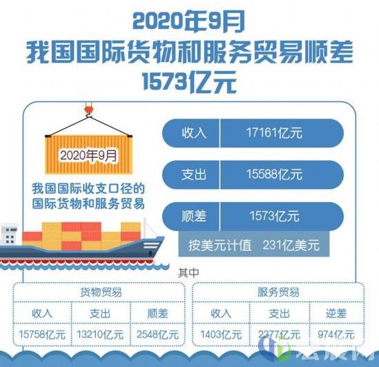 按美元计值,2020年9月,我国国际收支口径的国际货物和服务贸易顺差231亿美元。其中,货物贸易顺差374亿美元;服务贸易逆差143亿美元。