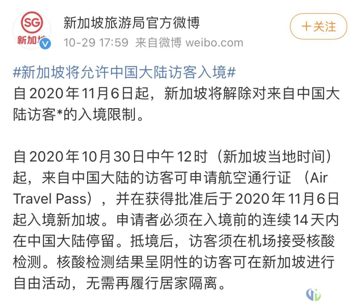 新加坡旅游局官方微博10月29日发布消息称,自2020年11月6日起,新加坡将解除对来自中国大陆访客的入境限制。