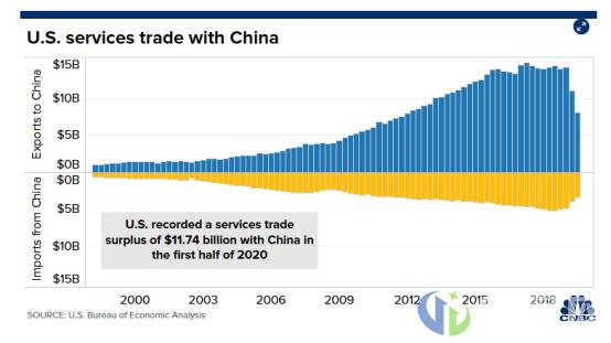 根据Bureau of Economic Analysis的数据显示,去年中美两国的双边货物和服务贸易总额仍然达到了6368亿美元巨额。不过,这种贸易关系是一种不平衡的关系。数据显示,在商品贸易中,美国从中国进口的商品数量远远多于向中国出口的商品数量;但在服务贸易中则呈现出中国从美国进口的数量多于向美国出口的数量之势。