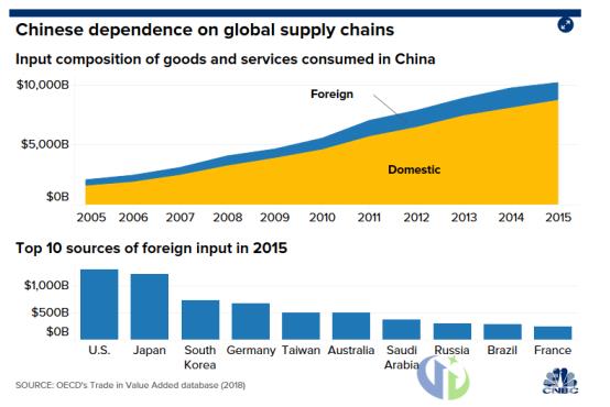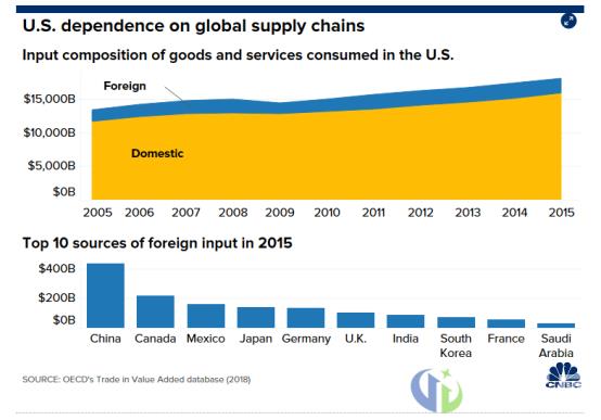 除了直接贸易,Fitch Ratings在上个月中的一份报告中表示,中美两国“在过去十年中通过不断紧密的供应链联系变得越来越依赖彼此。”由于供应链是一个提供原材料、中间部件或专业技术以生产可在国内或全球消费的最终产品或服务的复杂且重要的工作网络,因此很难收集每个公司的具体供应链贡献细分数据,但经合组织2013年推出一个数据库提供了一些关于全球供应链如何运作的见解和相关数据预测。根据经合组织最新获得的估计数据显示,2015年,外国投入占美国消费的商品和服务总额的12.2%(约2.2万亿美元),其中中国是最大贡献国。Fitch Ratings援引经合组织的数据说,美国国内的一些纺织品、电子、基本金属和机械生产商制造商特别依赖中国的半成品或是成品。