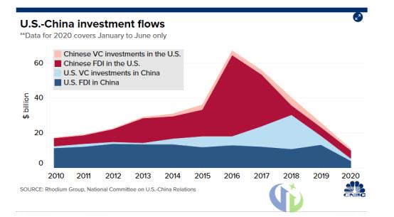 虽然贸易和供应链的相互依存关系在短时间内不会彻底脱钩,但随着中美双边紧张关系的升级,中美之间的投资流量已经下降。根据Rhodium Group的数据,过去三年,两国之间的直接投资和风险投资交易总额一直在下降。Rhodium在一份报告中表示,“数据显示,中国企业对美国科技资产的收购有所减少。”与此同时,美国在中国的投资相对“更有弹性”。且Fitch指出,许多在华经营的美国企业表示,他们尚未打算撤出中国市场。另外,AmCham China去年进行的一项调查数据,83%的受访者表示他们没有考虑将制造业或采购业务搬到中国以外的市场。Fitch表示,与过去的相比,有意留在中国的公司比例有所上升(2018年该数据为80%,2017年为77%。)
