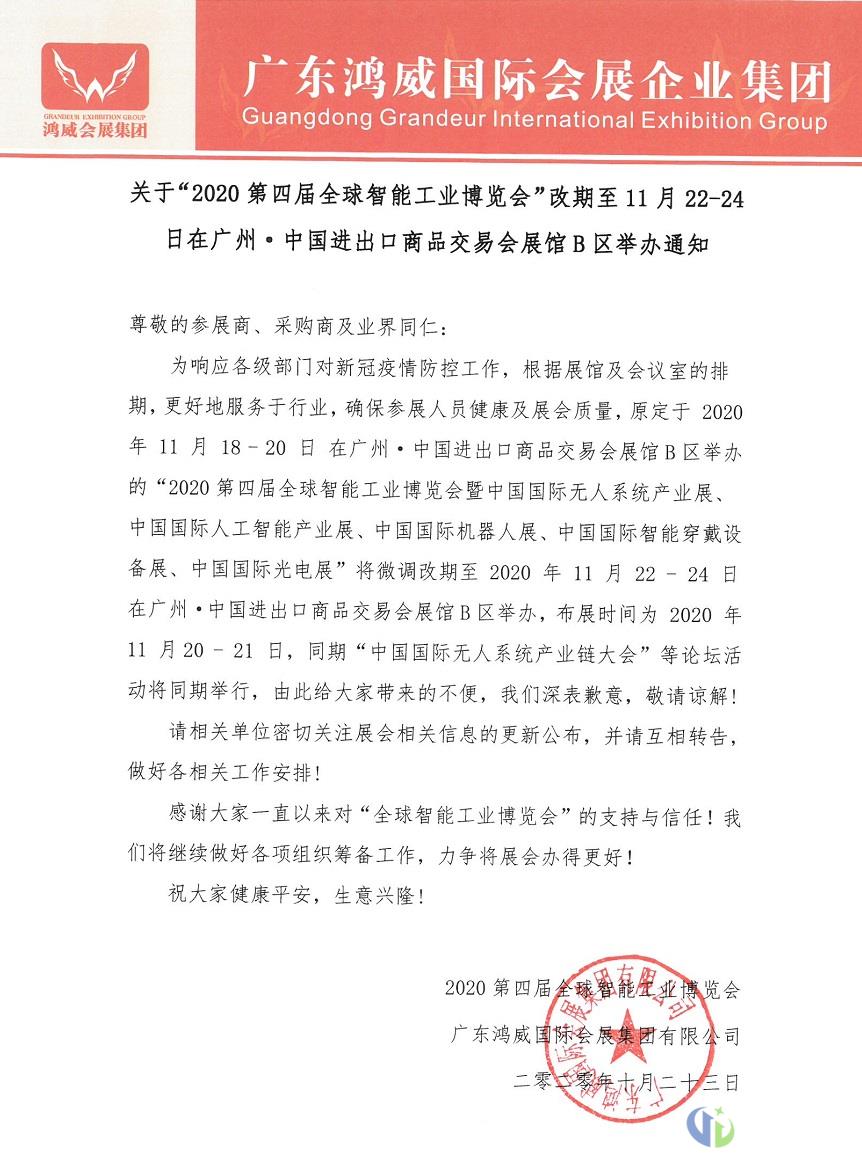 为响应各级部门对新冠疫情防控工作,根据展馆及会议室的排期,更好地服务于行业,确保参展人员健康及展会质量,原定于2020 年11月18-20日在广州·中国进出口商品交易会展馆B区举办的2020中国国际应用科技交易博览会将改期至2020年11月22-24日举办,地点不变。布展时间为2020年11月20-21日,同期“中国国际无人系统产业链大会”等论坛活动随展会顺延。