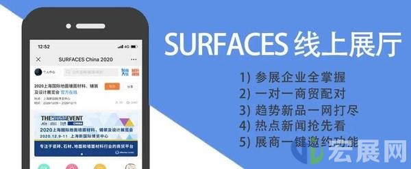 SURFACES China 2020紧跟数字化脚步,强势推出手机小程序“SURFACES线上展厅”,旨在给广大展商和观众带来更完善的展贸服务体验:线上展厅产品抢先看,线下逛展精准对接,双管齐下,全面提升参展效果及观展质量!