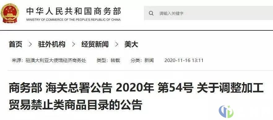 商务部、海关总署近日联合发布2020年第54号关于调整加工贸易禁止类商品目录的公告,从原有加工贸易禁止类商品目录中剔除了符合国家产业政策,不属于高耗能、高污染的产品以及具有较高技术含量的199个十位商品编码,包括钛白粉、纯碱、小苏打、尿素、硝酸钠、硫酸钾等。调整后的目录将于2020年12月1日起开始执行。