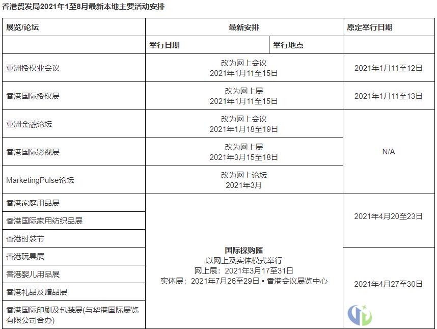 鉴于疫情持续,国际差旅严重受阻,香港贸发局将重新安排2021上半年的展览及会议,以协助中小企在疫情下继续捕捉新机遇。除了加强以混合模式结合网上与实体的展览与会议,更将筹划全新本地展览。另外,一系列包括金融、创意产业、市场营销等行业的国际活动,则移师网上举行,跨越地域限制,为业界开拓商机。