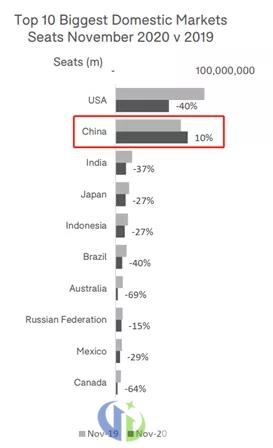 11月,全球运力排名前十的航线中,其中有四条都在中国。而2019年,中国只有北京-上海这一条航线的运力进入前十名。OAG 发布的2020年11月《航班班次和运力分析报告》显示,中国国内市场的运力相比去年,同期上升了10%。这表明,中国已经从复苏迈向了增长。