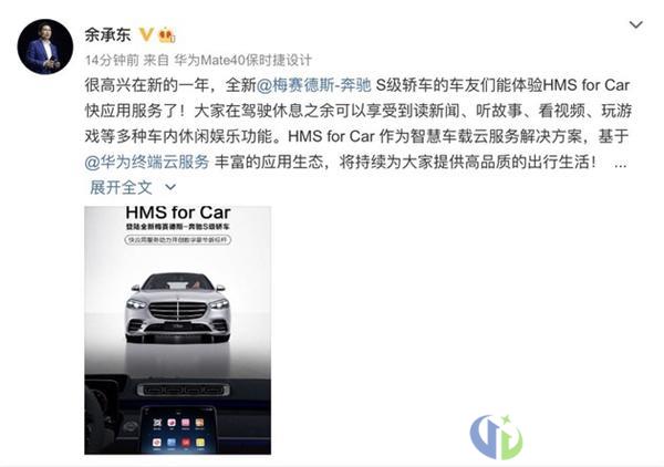 2月21日,华为消费者业务CEO余承东对外公开表示,华为和奔驰展开合作,华为的HMS for Car快应用服务将登陆梅赛德斯-奔驰S级轿车。