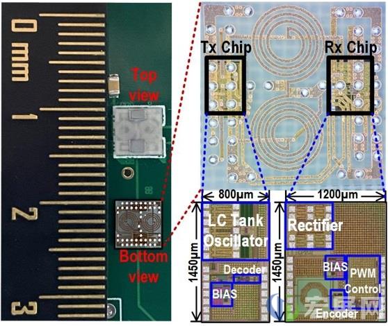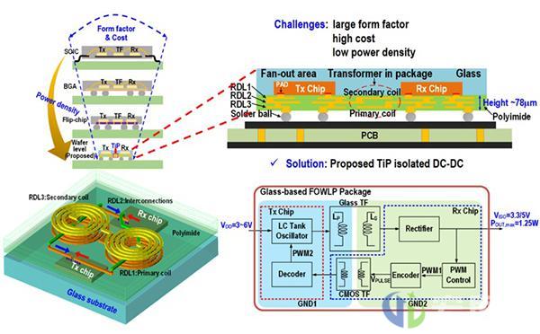 与传统隔离电源芯片相比,该研究基于利用先进的玻璃扇出型晶圆级封装技术,将接收和发射芯片通过封装上可再布线层制成的微型变压器进行互联封装,不需要额外的变压器芯片,克服了现有芯片设计中需要三颗甚至四颗芯片的缺点从而大大提高了隔离电源的转换效率和功率密度。