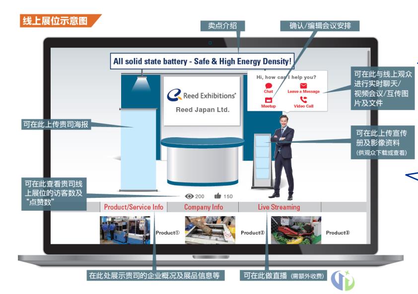 4. 线上展位将在展前2周向观众开放,观众将可以向您发送商谈邀请,并将收到下载PDF资料的观众列表,还可以通过邮件/实时聊天与访问过您线上展位的观众及时联系。