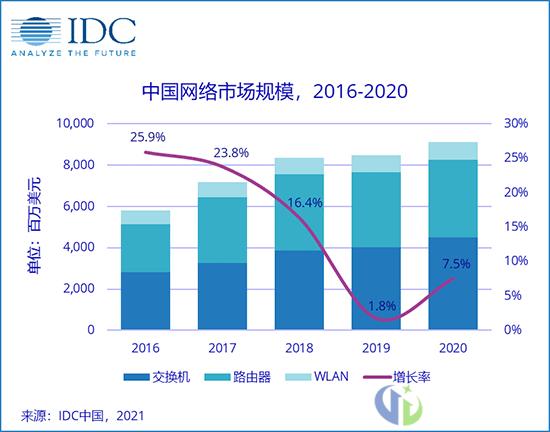 4月7日,IDC发布的《2020 年网络市场跟踪报告》显示,2020年全球网络市场规模为490.1亿美元,与去年同期相比下滑3%,其中交换机、路由器和WLAN市场增速分别为-3.5%、-4.0%和1.9%。