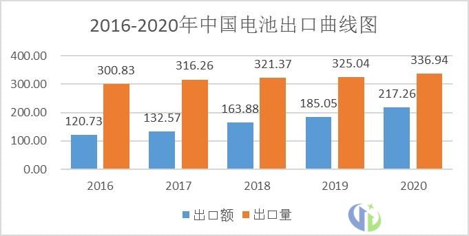 2016-2020年中国电池出口曲线图(出口额:亿美元;出口量:亿只,下同)