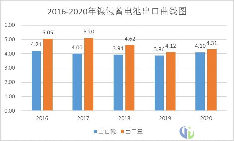 2020年镍氢蓄电池出口量为4.31亿只,2019年出口量为4.12亿只,与上一年相比,同比增长了4.61%。2020年镍氢蓄电池出口额为4.10亿美元,2019年出口额为3.86亿美元,与上一年相比,同比增长了6.22%。