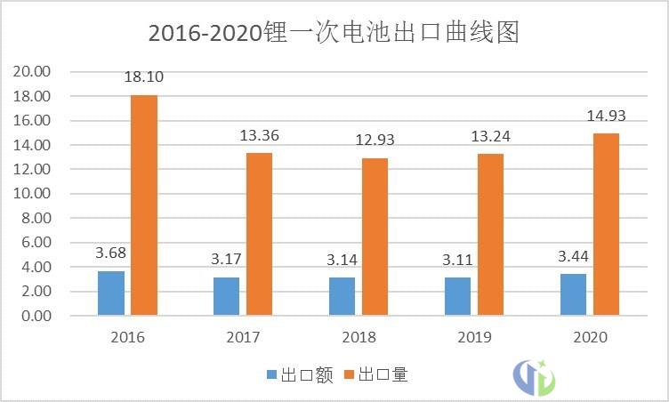 2020年锂一次电池出口量为14.93亿只,2019年出口量为13.24亿只,与上一年相比,同比上涨了12.76%。2020年锂一次电池出口额为3.44亿美元,2019年出口额为3.11亿美元,与上一年相比,同比上涨了10.61%。