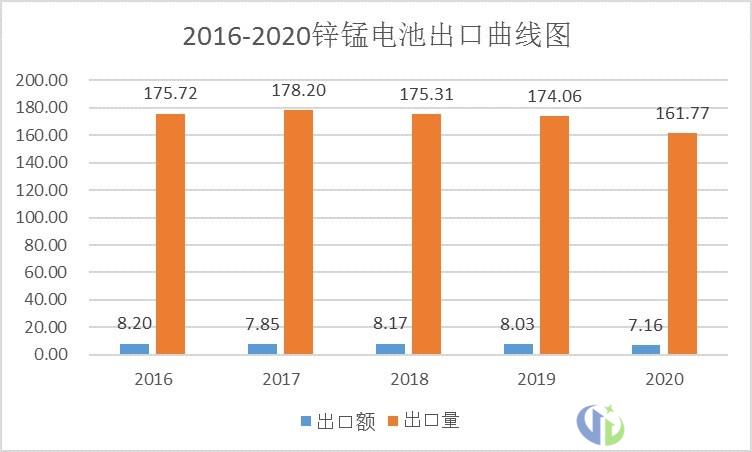 2020年锌锰电池出口量为161.77亿只,2019年出口量为174.06亿只,与上一年相比,同比下降了7.06%。2020年锌锰电池出口额为7.16亿美元,2019年出口额为8.03亿美元,同比下降了10.83%。