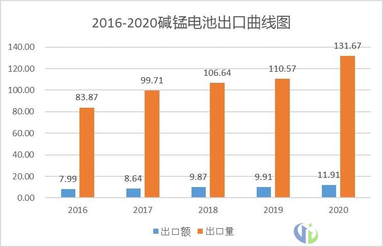 2020年碱锰电池出口量为131.67亿只,2019年出口量为110.57亿只,与上一年相比,同比上涨了19.08%。2020年碱锰电池出口额为11.91亿美元,2019年出口额为9.91亿美元,与上一年相比,同比上涨了20.18%。