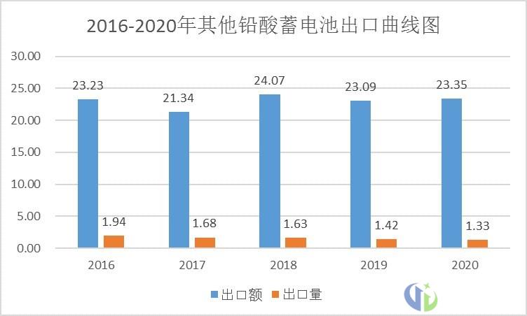 2020年其他铅酸蓄电池出口量为1.33亿只,2019年出口量为1.42亿只,与上一年相比,同比下降了6.34%。2020年其他铅酸蓄电池出口额为23.35亿美元,2019年出口额为23.09亿美元,同比上涨了1.13%。