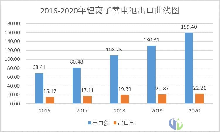 2020年锂离子蓄电池出口量为22.21亿只,2019年出口量为20.87亿只,与上一年相比,同比上涨了6.42%。2020年锂离子蓄电池出口额为159.40亿美元,2019年出口额为130.31亿美元,同比上涨了22.32%。