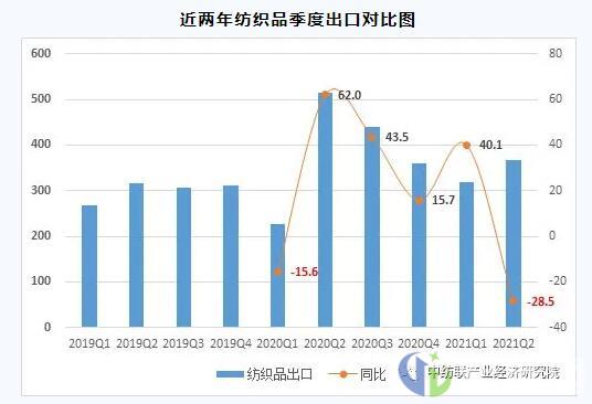 去年一季度受疫情爆发影响,我国纺织品出口呈现2015年以来的季度低点,出口仅269.0亿美元;到二季度受全球防疫物资需求猛增影响,纺织品季度出口实现了历史高点,达到514.3亿美元。在基数效应作用下,今年二季度纺织品出口下降28.5%,但从绝对数值看,今年二季度纺织品出口367.9亿美元,仍高于疫情前2019年的每个季度。