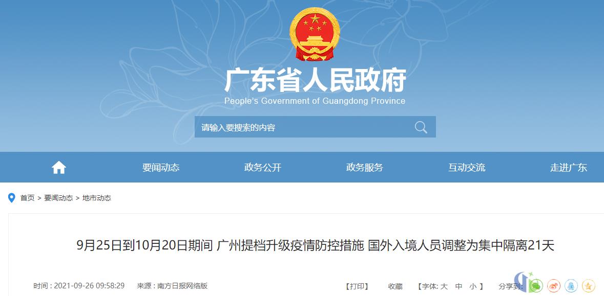 其中,措施包括,强化入境人员闭环管理,点对点无缝衔接。即日起至10月20日期间,对所有从国外入境人员隔离政策由集中隔离14天+居家隔离7天调整为一律实施集中隔离21天,核酸采样检测频率调整为1、2、3、7、14、17、19、21天;建立快速转运机制,入境人员在外市集中隔离期满14天后返穗的,一律闭环转运至酒店集中隔离7天。
